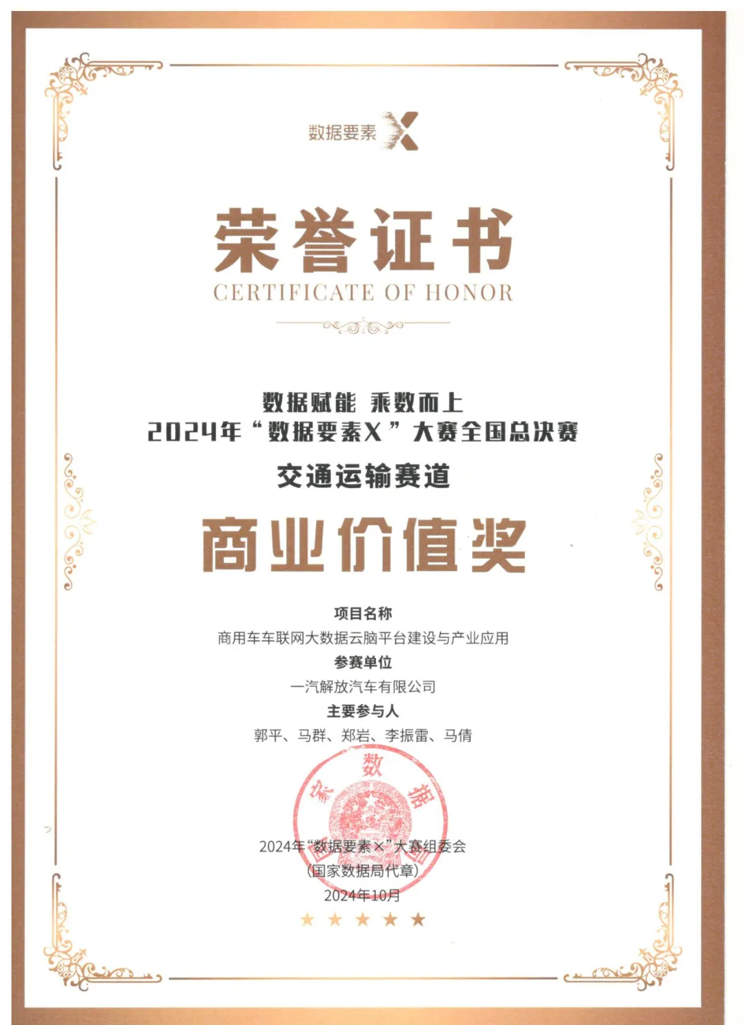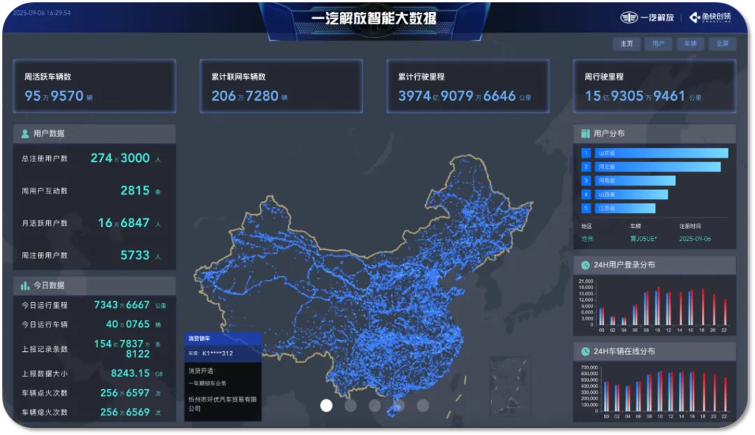 其次在网联数据领域,解放车联网平台已经连接车辆超过210万辆,车辆累计行驶里程3974亿公里,数据量超过6.15PB。基于海量真实运行数据,一汽解放进一步推出了解放行APP、车队管理、安全管家、智能诊修、销贷锁车、ETC和加油等产品与服务,得到了广大用户的高度认可。2024年,一汽解放车联网云脑大数据平台荣获“数据要素X”全国总决赛“商业价值奖”,也是全国唯一入围并获奖的整车厂。