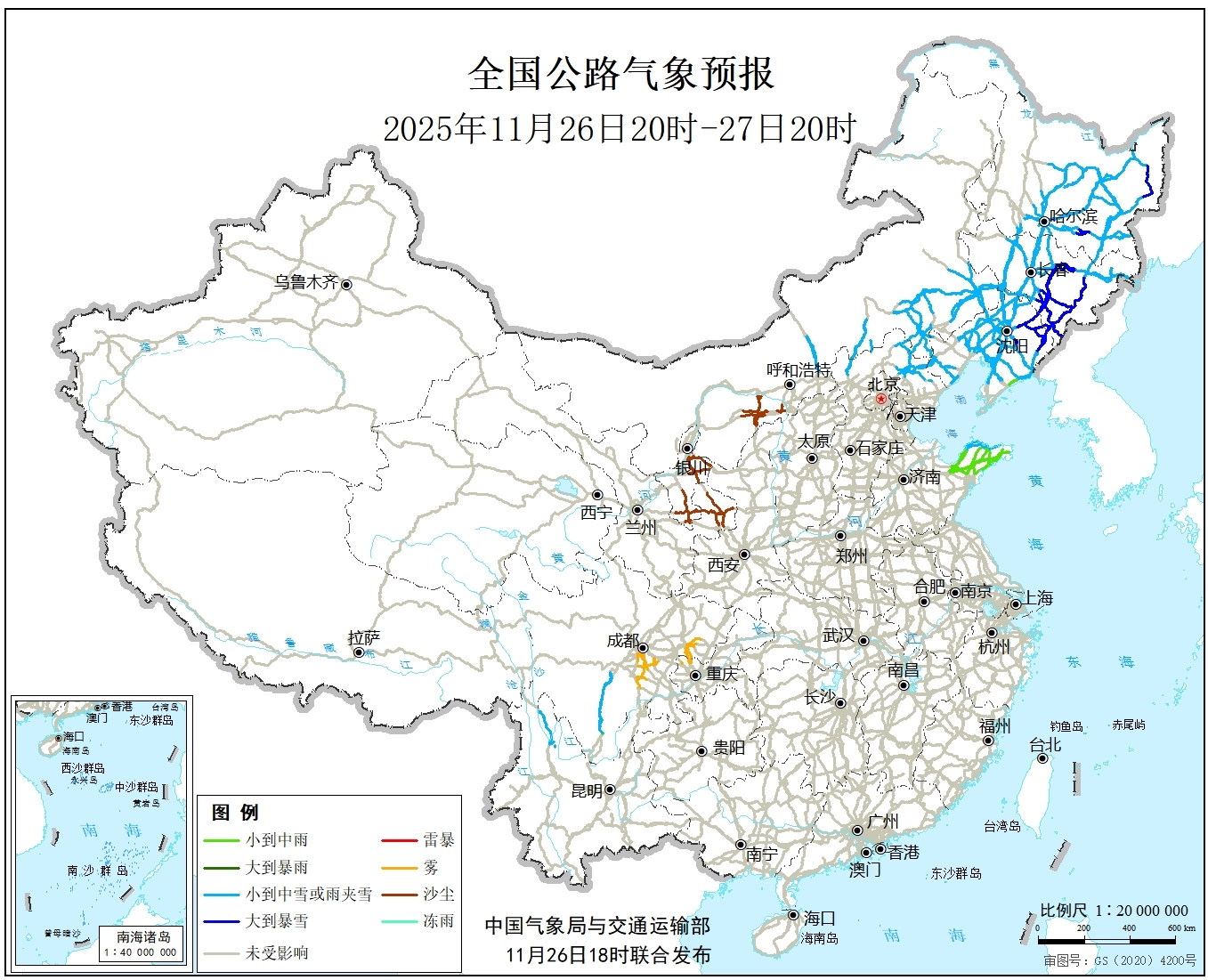 中国气象局与交通运输部2025年11月26日联合发布全国主要公路气象预报