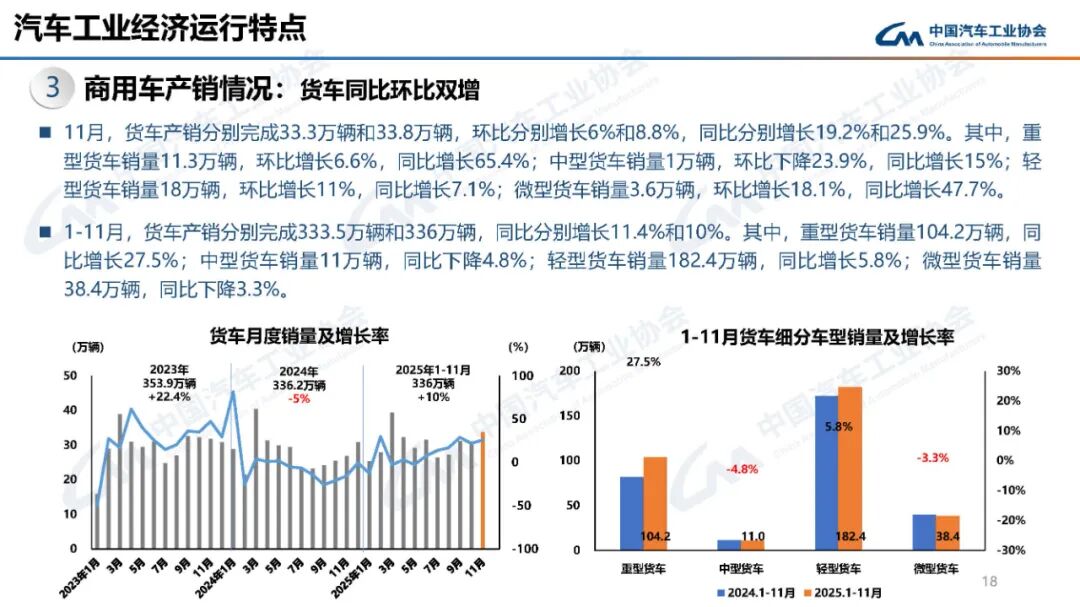 1-11月,货车产销分别完成333.5万辆和336万辆,同比分别增长11.4%和10%。其中,重型货车销量104.2万辆,同比增长27.5%;中型货车销量11万辆,同比下降4.8%;轻型货车销量182.4万辆,同比增长5.8%;微型货车销量38.4万辆,同比下降3.3%。