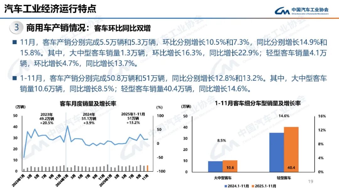 1-11月,客车产销分别完成50.8万辆和51万辆,同比分别增长12.8%和13.2%。其中,大中型客车销量10.6万辆,同比增长8.5%;轻型客车销量40.4万辆,同比增长14.6%.
