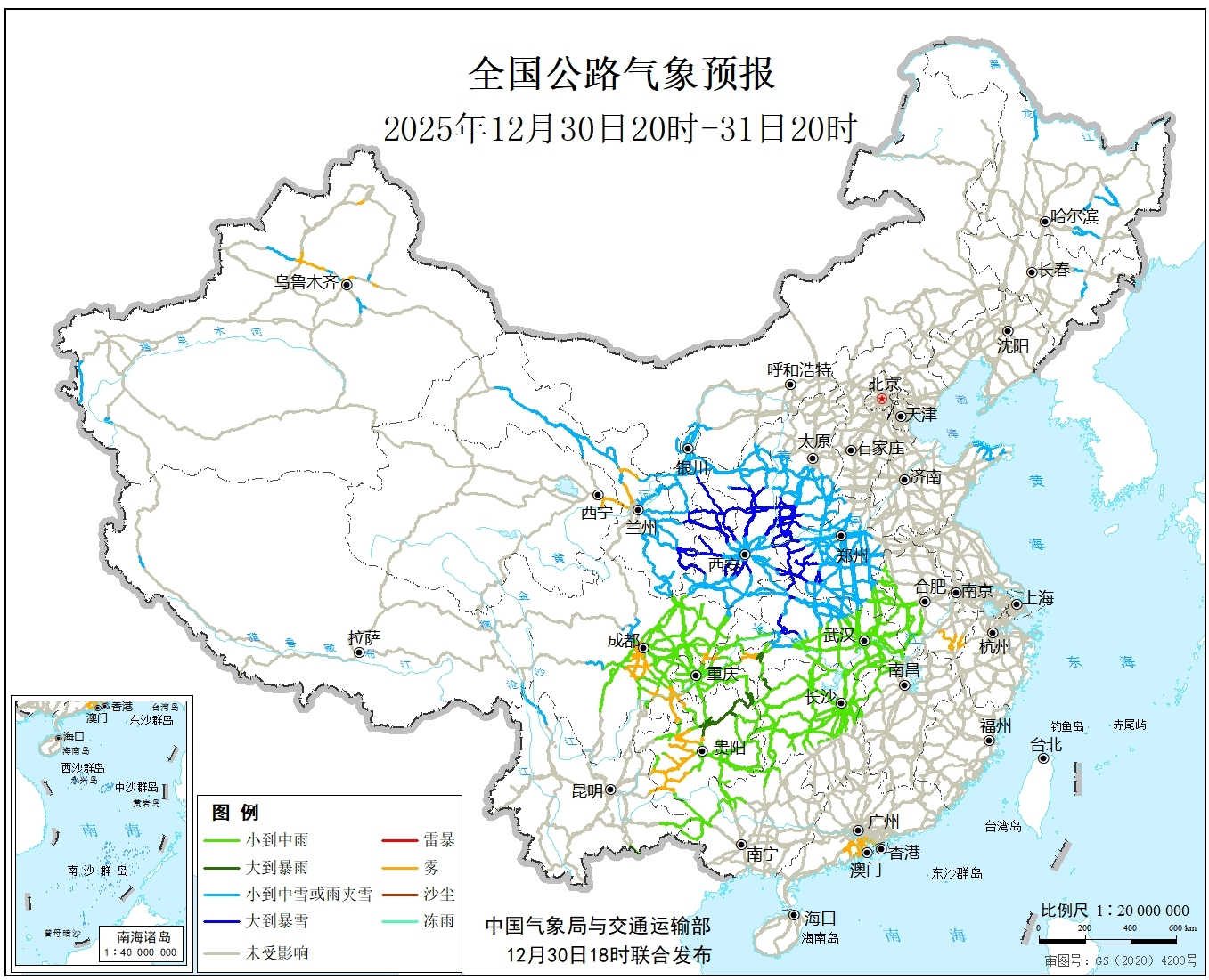 12月30日20时至31日20时,内蒙古西部、西北地区中东部、山西南部、河南中西部、湖北北部、重庆东北部等地部分地区有小到中雪或雨夹雪,其中,甘肃东部和南部、宁夏中南部、陕西中北部、山西南部、河南西部、湖北西部等地部分地区有大到暴雪(10~15毫米)。江汉大部、江南北部和西部、西南地区东部、广西西北部等地部分地区有小到中雨,其中,湖北西南部、湖南西北部、重庆东南部、贵州北部等地部分地区有大雨(25~30毫米)。另外,安徽东南部、湖北西南部、重庆西部、四川东部、贵州西部、广东南部、甘肃中部、青海东部、新疆北部等地局地有雾。