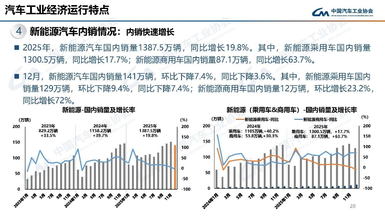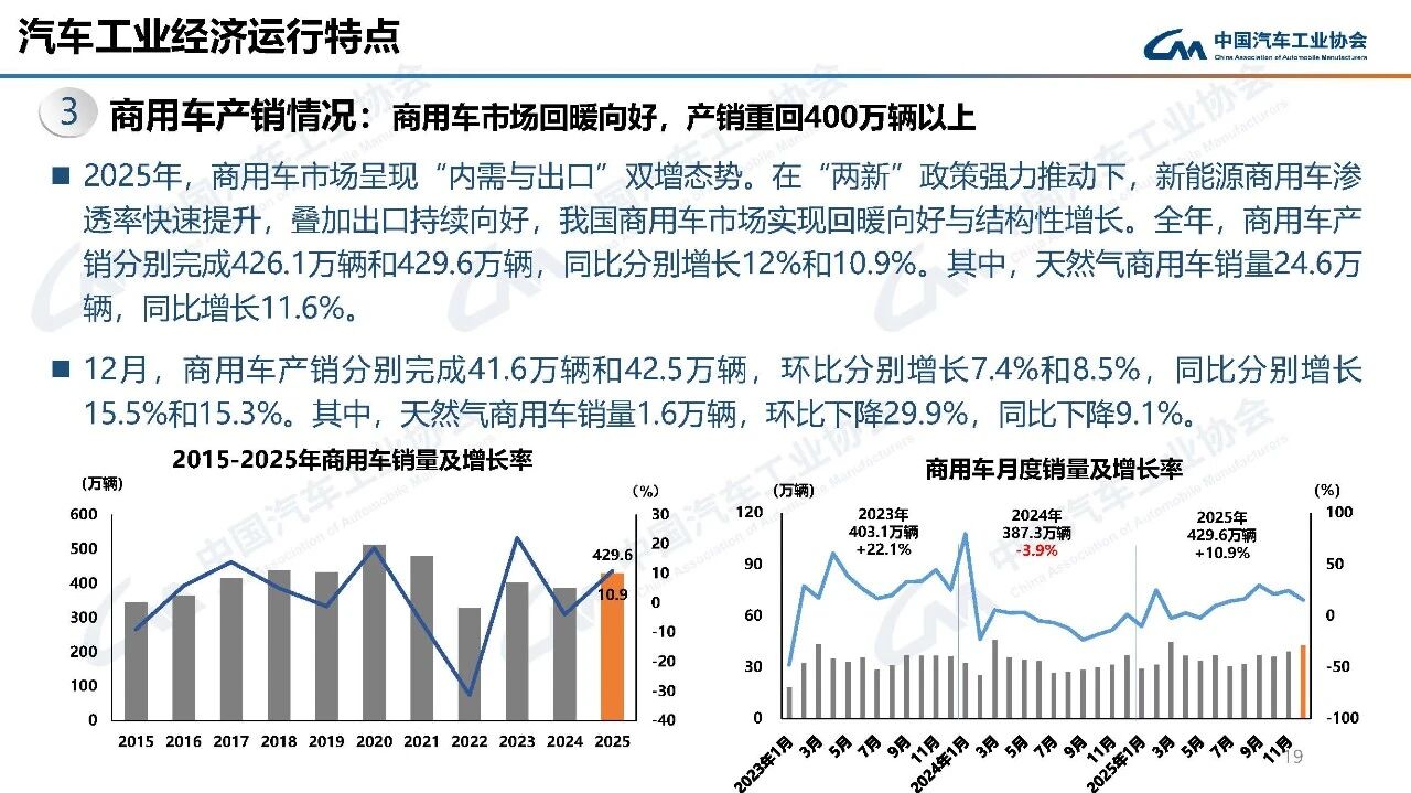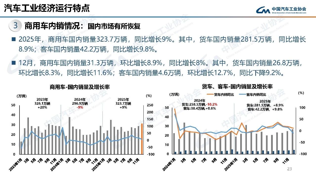 2025年,商用车国内销量323.7万辆,同比增长9%。其中,货车国内销量281.5万辆,同比增长8.9%;客车国内销量42.2万辆,同比增长9.8%。