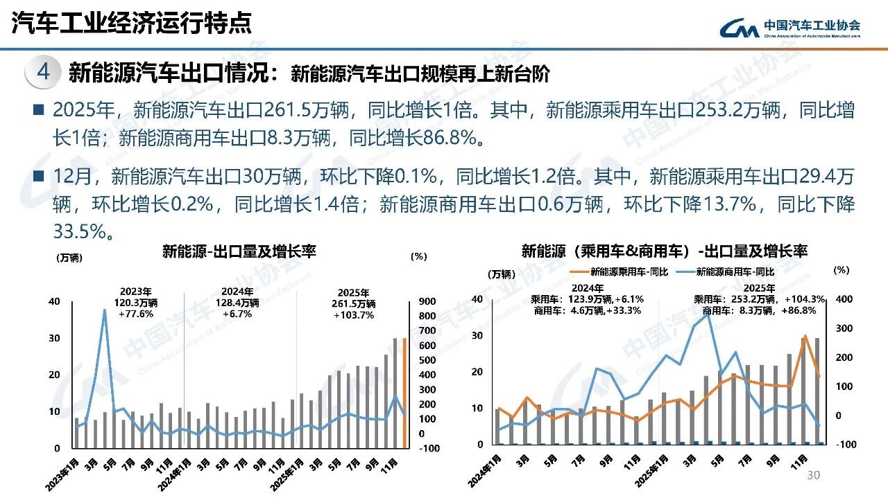 2025年,新能源商用车出口8.3万辆,同比增长86.8%。12月,新能源商用车出口0.6万辆,环比下降13.7%,同比下降33.5%。