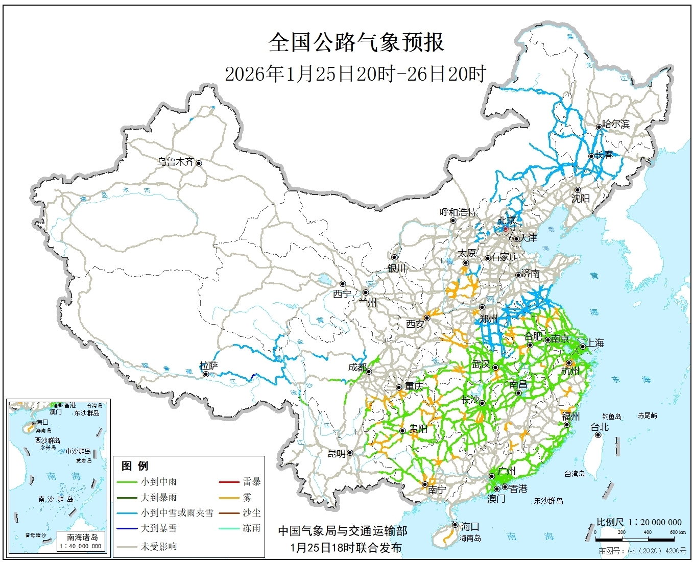 中国气象局与交通运输部2026年01月25日联合发布全国主要公路气象预报