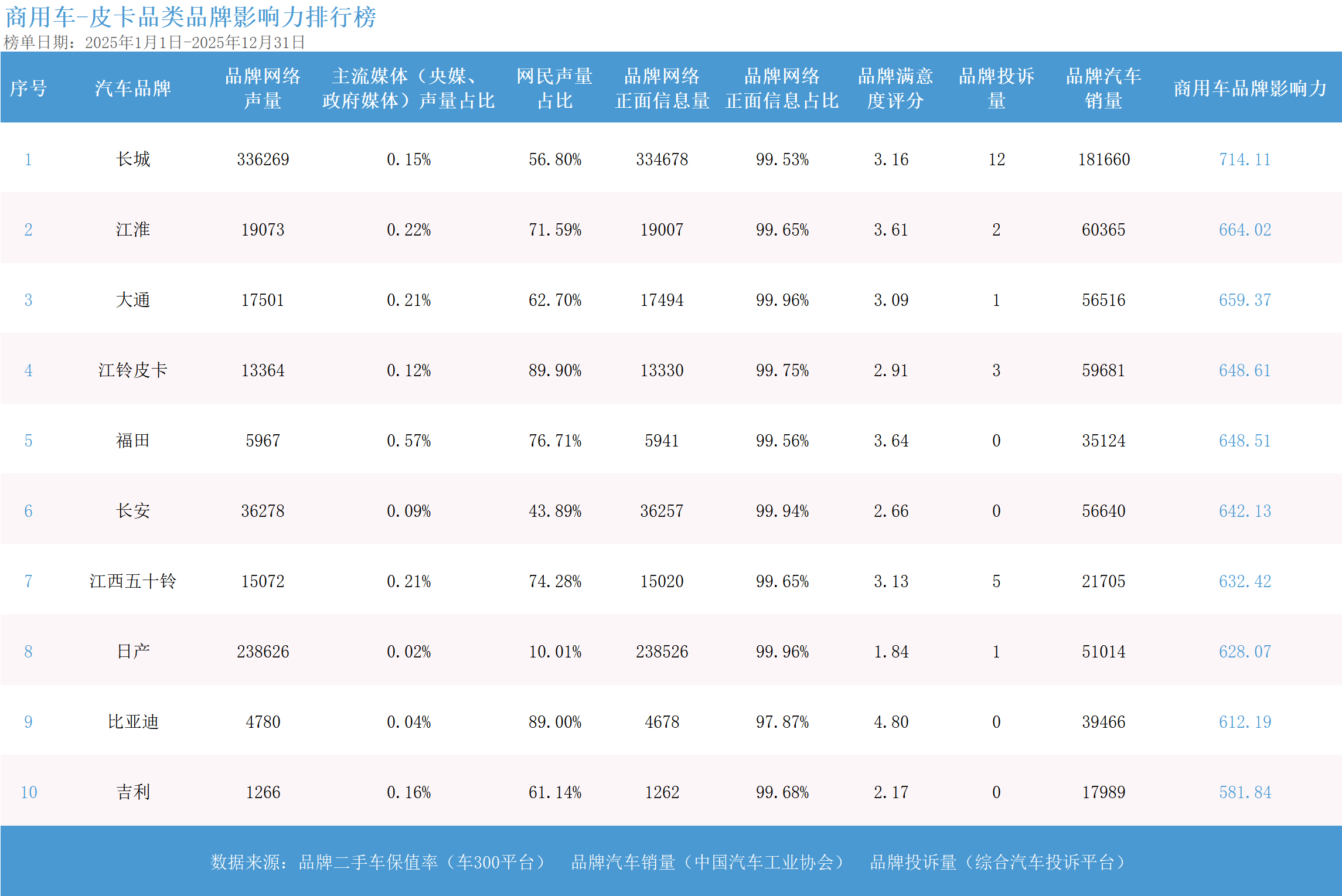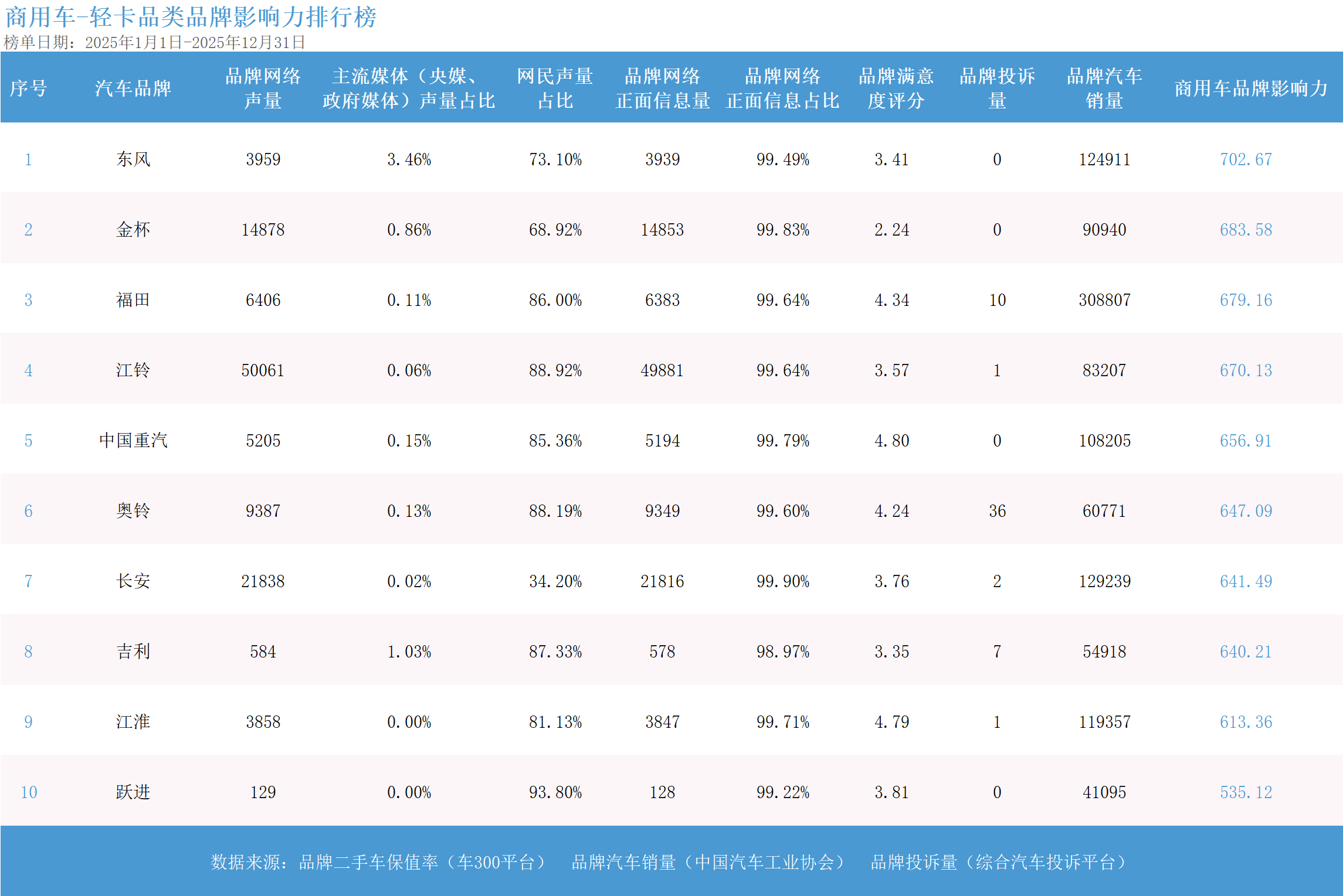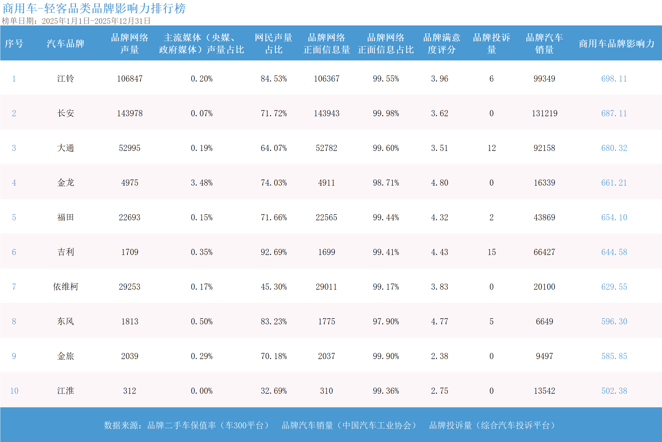 而在轻客市场,江铃汽车以698.11分再度领跑,其高达99.55%的正面信息占比与接近10万辆的年度销量,生动诠释了在B端客户市场中,以“可靠”和“低使用成本”为核心建立的品牌信任所带来的巨大商业价值;长安凯程则以超过13万辆的销量规模紧随其后,并在新能源轻客车型上实现了快速增长,展现出强大的市场适应力。