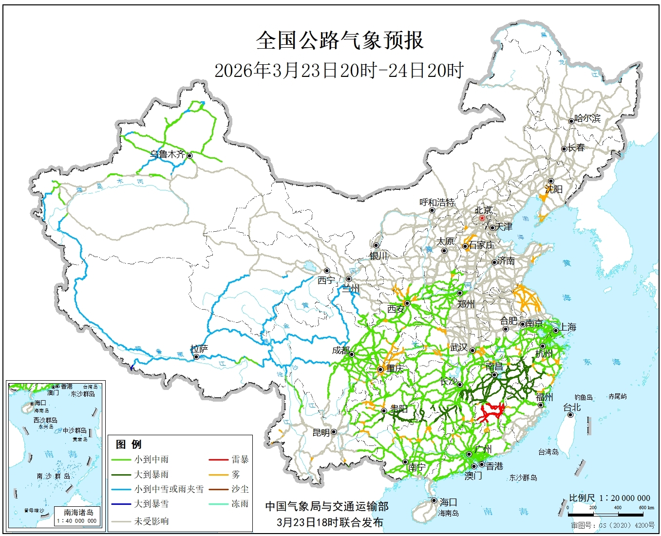 3月23日20时至24日20时,新疆南疆高海拔山区、西藏大部、青海中南部、川西高原等地部分地区有小雪或雨夹雪,其中,新疆北疆和沿天山地区、西藏东部和南部等地部分地区有中到大雪。西藏东南部、西南地区东部、江南大部等地部分地区有中到大雨,其中,贵州东南部、广西东北部、湖南南部、江西中部、福建西北部等地部分地区有暴雨。另外,辽宁中南部、河北南部、山东半岛、江苏北部、安徽南部、浙江中南部、江西南部、福建中部、湖北中东部、湖南东南部、广东北部、广西北部、四川东部、云南南部、贵州北部和西南部、陕西南部等地局地有雾;江西南部有雷暴。