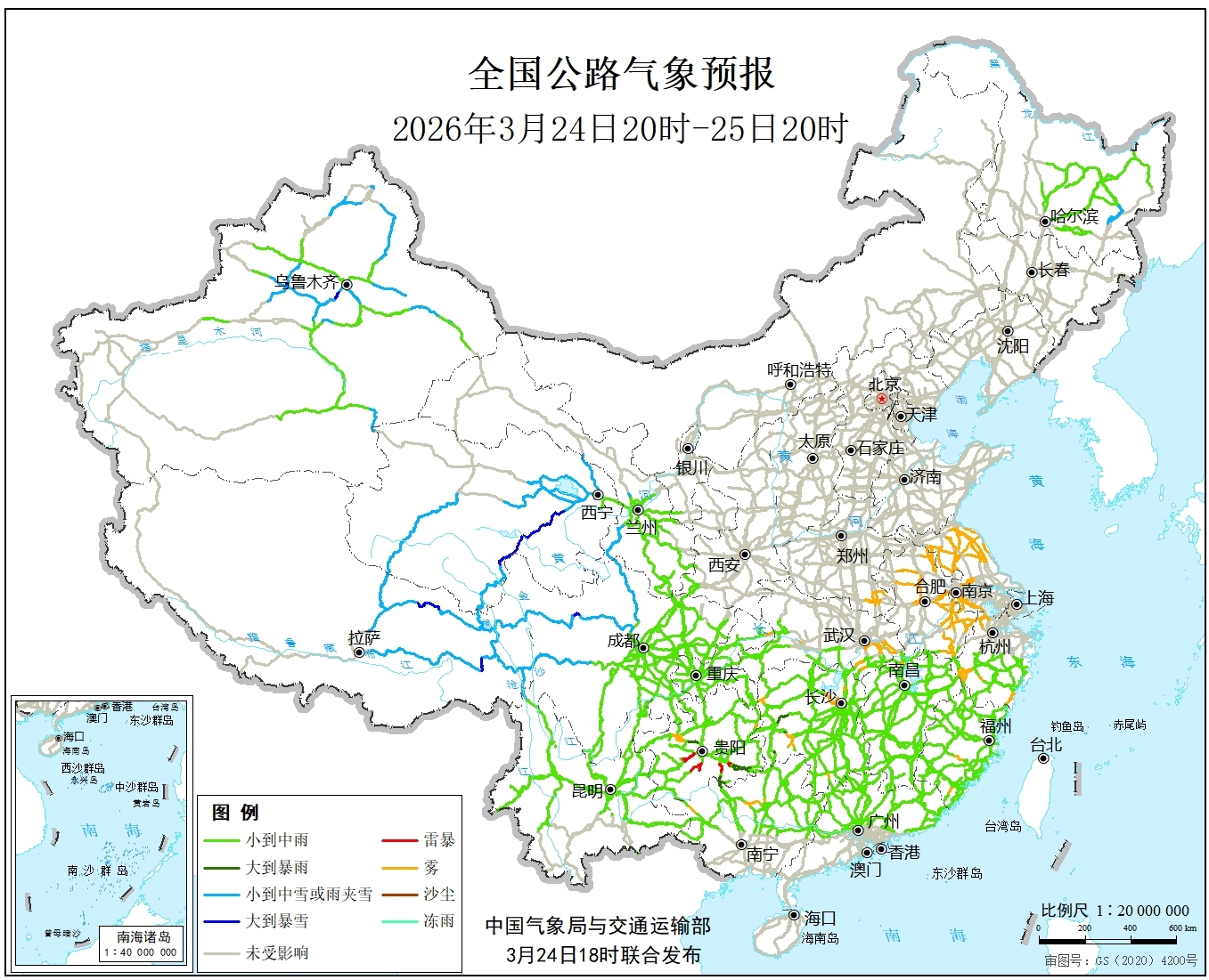 中国气象局与交通运输部2026年03月24日联合发布全国主要公路气象预报