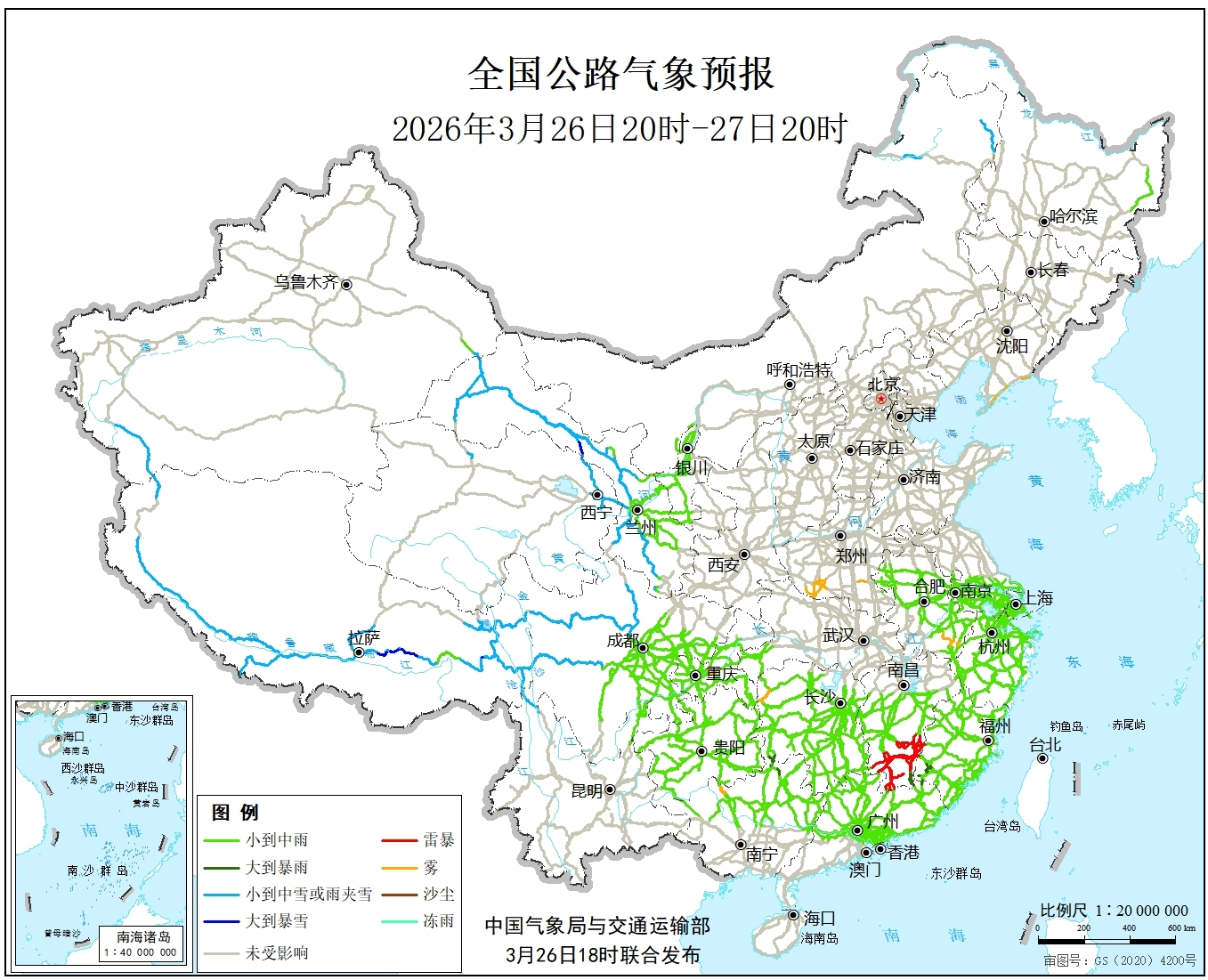 3月26日20时至27日20时,内蒙古东北部、黑龙江西北部、西藏中南部、青海北部、甘肃河西、川西高原中南部等地部分地区有小到中雪或雨夹雪,其中,甘肃河西、西藏东南部等地部分地区有大到暴雪(10~15毫米);西藏东南部、贵州东部、湖南南部和西部、江西南部、福建东部、广西东北部、广东北部、台湾岛北部等地部分地区有中到大雨,其中,福建西南部局地有暴雨(50~65毫米),江西南部局地有雷暴。另外,河南南部、重庆中部、安徽南部等地的部分地区有大雾,局地有能见度不足500米的浓雾。