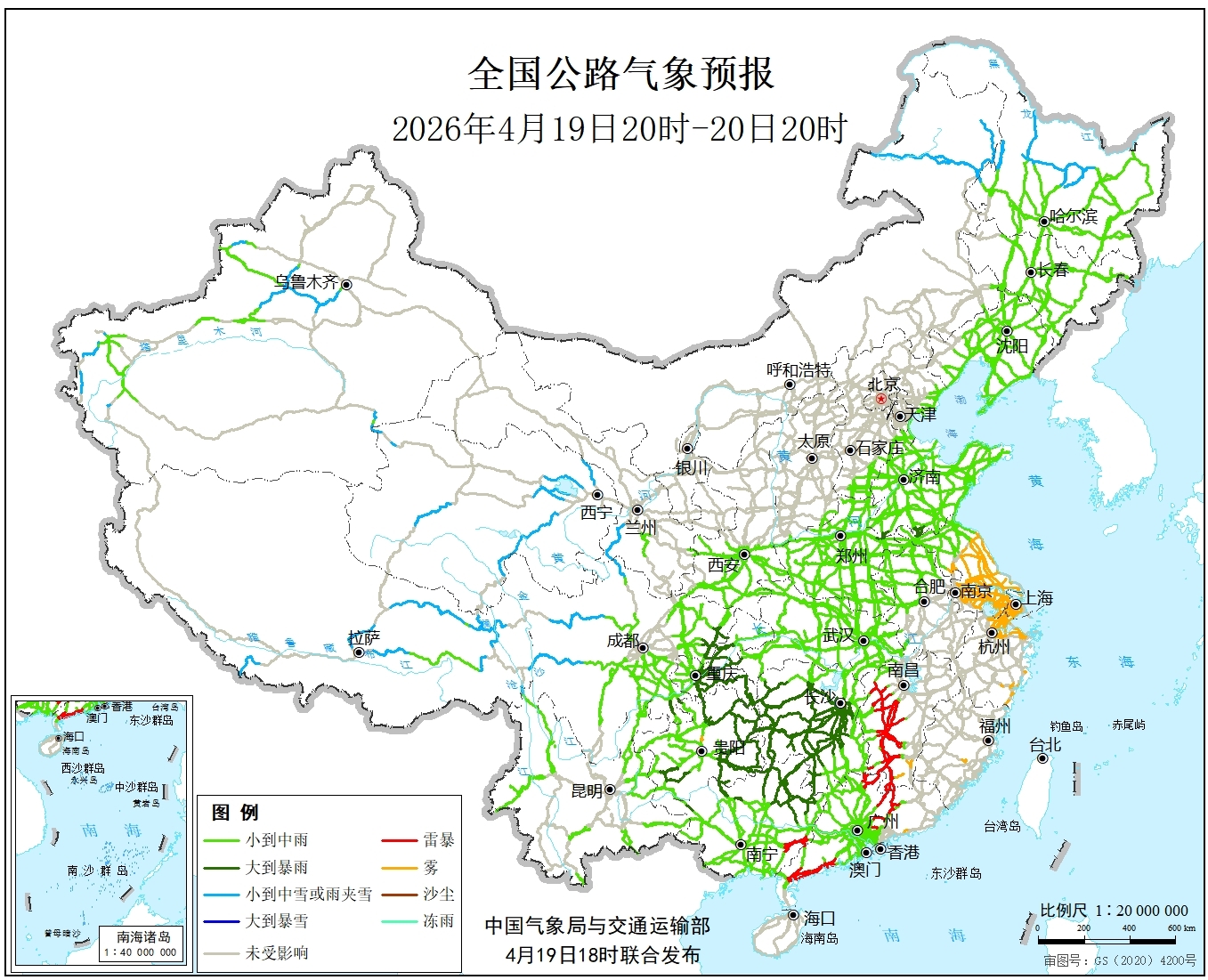 全国公路气象预报(4月19日20时至20日20时)