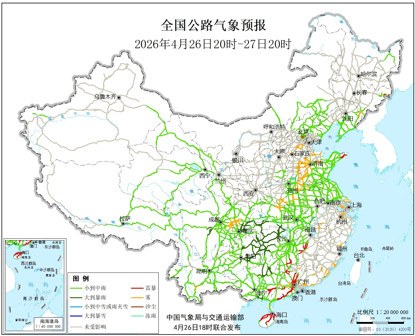 中国气象局与交通运输部2026年04月26日联合发布全国主要公路气象预报