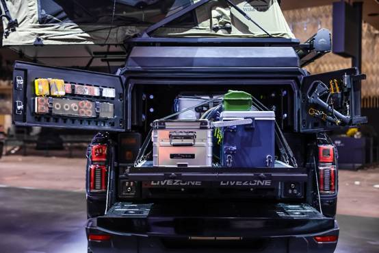 收纳上,装备分区布局合理,空间利用高效,收纳精细便捷。后箱采用上下分层储物魔盒,上层抽拉托盘放钓台、钓箱等大件;下层双密封抽屉,一侧集成厨具模块,另一侧收纳线组、鱼漂等小件。两侧抽拉挂板带独立卡槽固定渔具,尾门挂板可挂工兵铲等装备。高盖两侧储物边仓存放竿包、鱼护等工具,车顶拓展平台装载108L储物箱等大件。