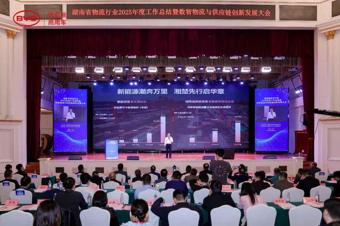 4月24日,湖南省物流行业2025年度工作总结暨数智物流与供应链创新发展大会在长沙举行。比亚迪商用车携纯电牵引车Q3、纯电动自卸车T31重磅亮相,现场达成150台新能源重卡战略签约,以全场景绿色运力方案,助力湖南物流行业低碳高效转型。