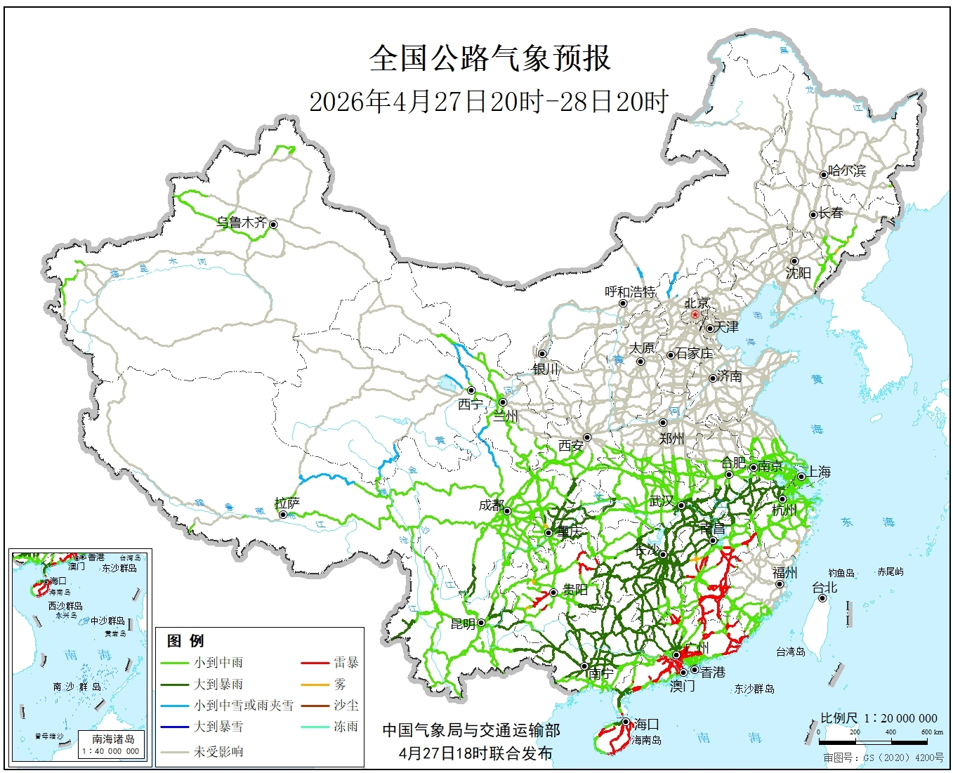 中国气象局与交通运输部2026年04月27日联合发布全国主要公路气象预报