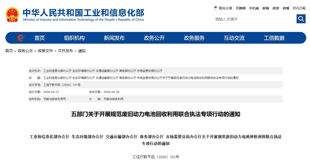 4月27日,工业和信息化部办公厅、生态环境部办公厅、交通运输部办公厅、商务部办公厅、市场监管总局办公厅联合发出通知,将开展规范废旧动力电池回收利用联合执法专项行动。