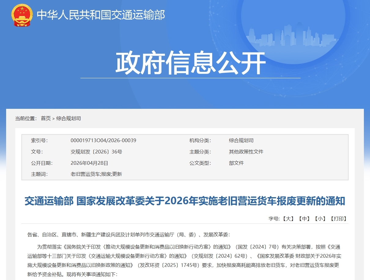 为贯彻落实《国务院关于印发〈推动大规模设备更新和消费品以旧换新行动方案〉的通知》(国发〔2024〕7号)有关决策部署,按照《交通运输部等十三部门关于印发〈交通运输大规模设备更新行动方案〉的通知》(交规划发〔2024〕62号)、《国家发展改革委 财政部关于2026年实施大规模设备更新和消费品以旧换新政策的通知》(发改环资〔2025〕1745号)要求,加快报废高耗能高排放老旧货车,对老旧营运货车报废更新给予资金补贴。现将有关事项通知如下: