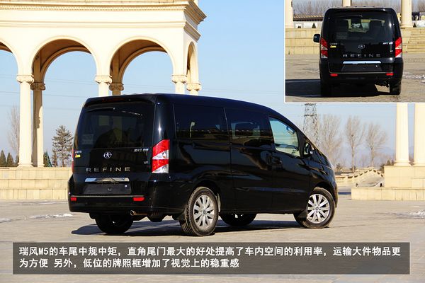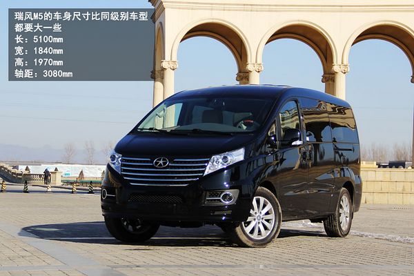 瑞风M5的外观设计与之前的瑞风Ⅱ相比并没有太多的变化,延续了较为硬朗的风格。车身尺寸上,瑞风M5比同级别其他车型大了一圈,其长宽高分别为5100mm、1840mm、1970mm,轴距达到3080mm。这样使得瑞风M5的车内乘坐空间进一步提升,主要体现在第二排和第三排腿部空间上。
